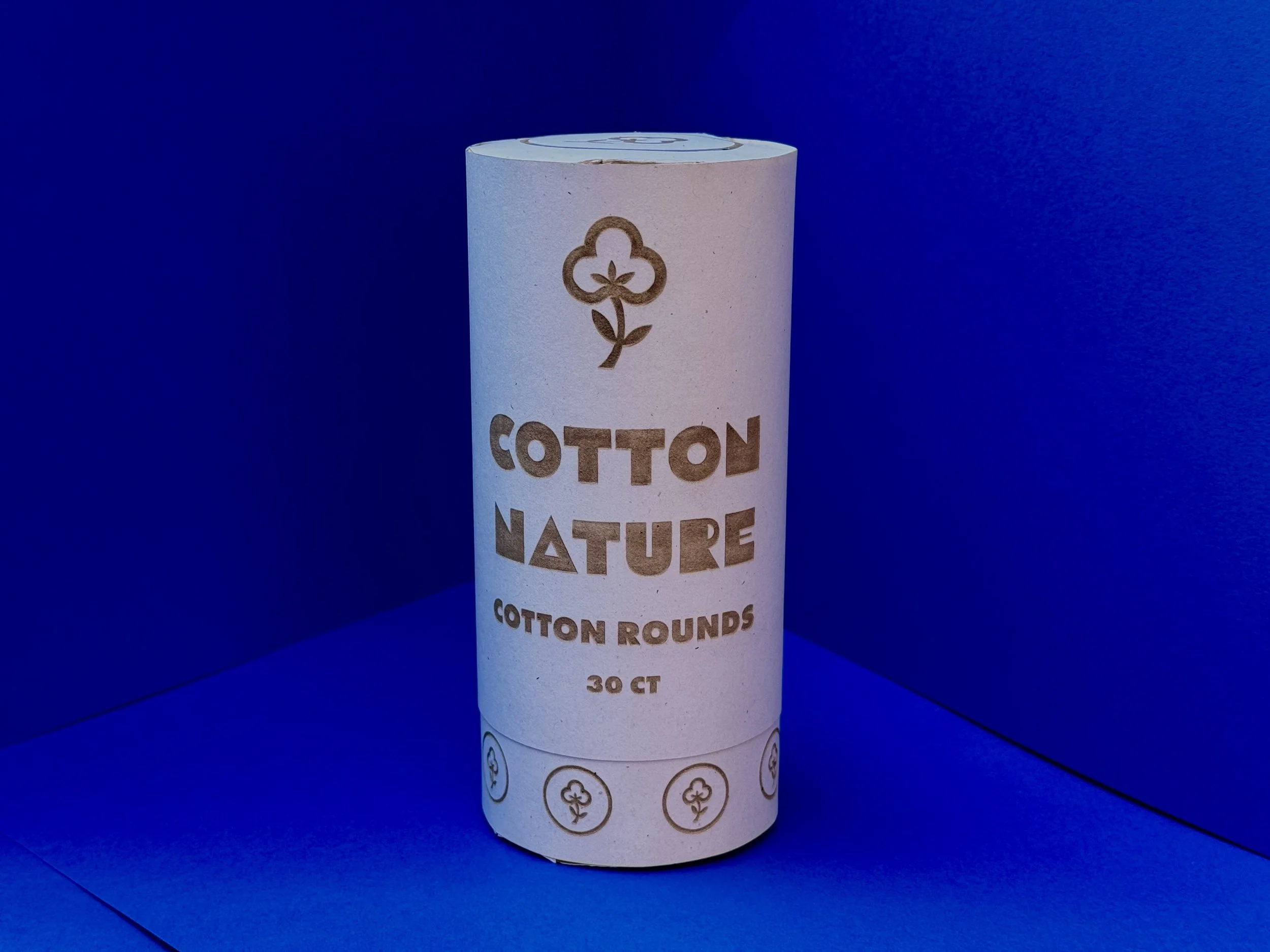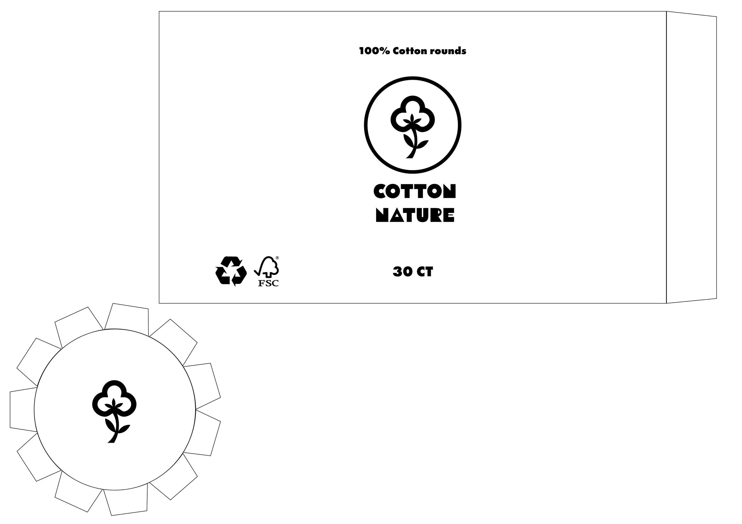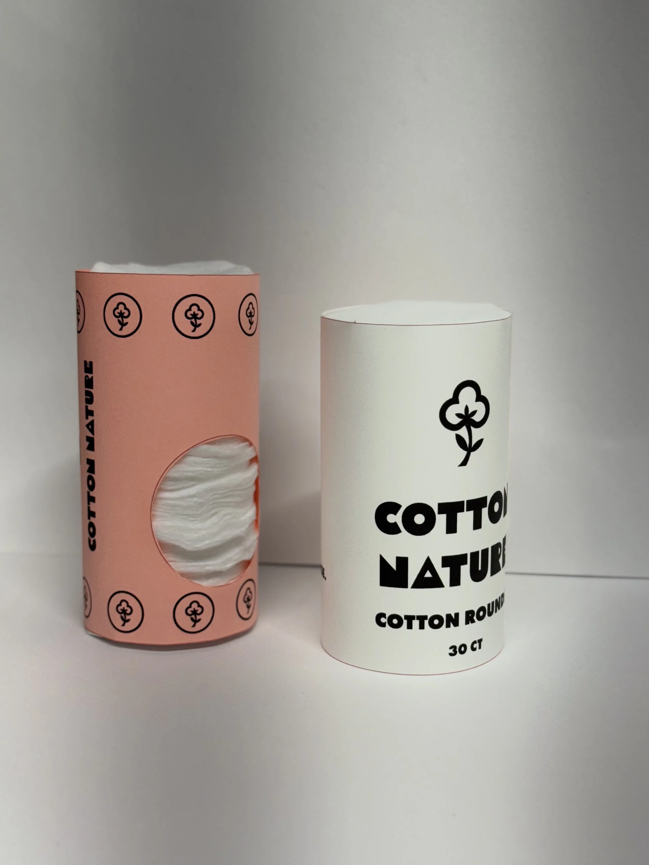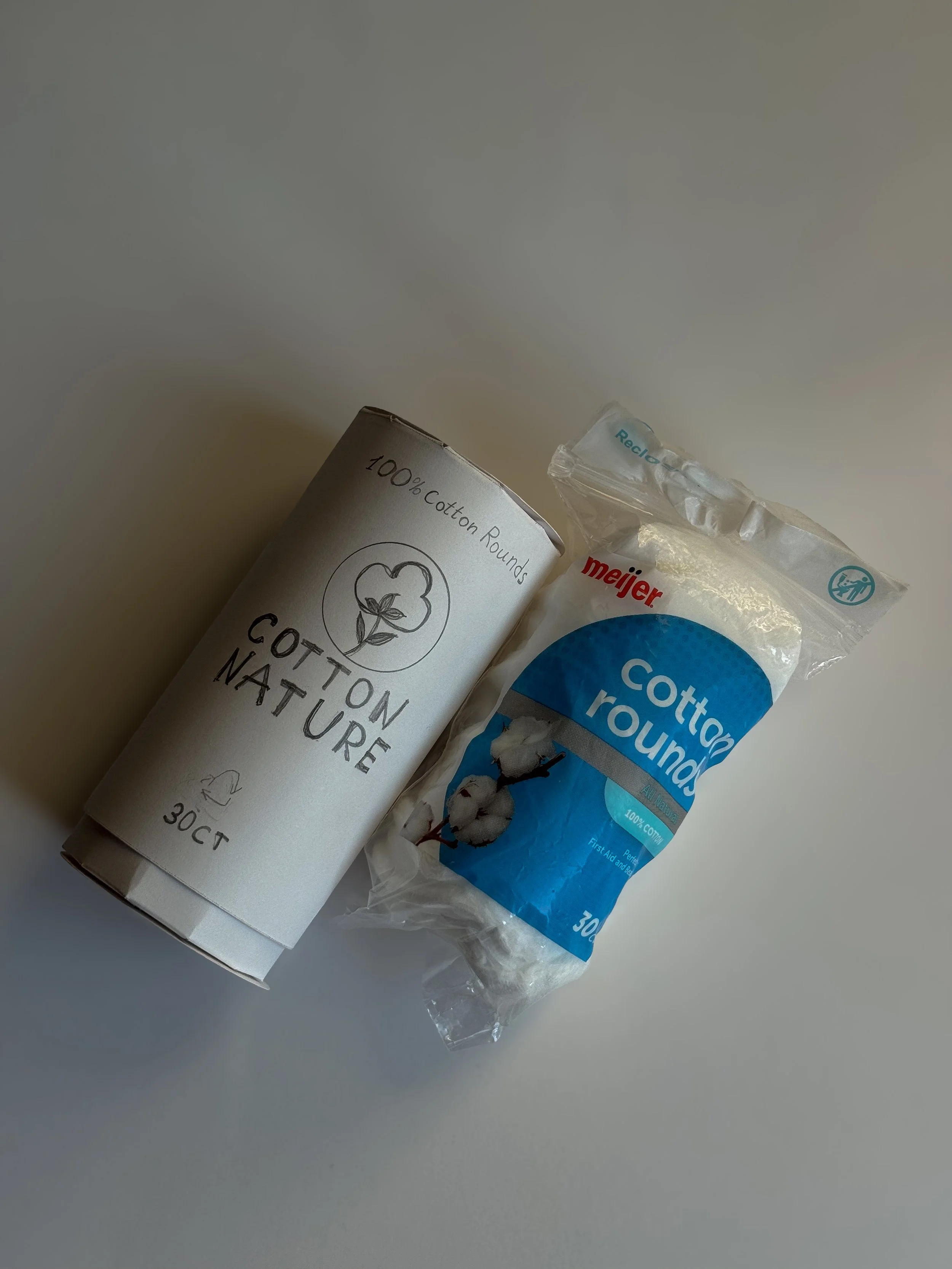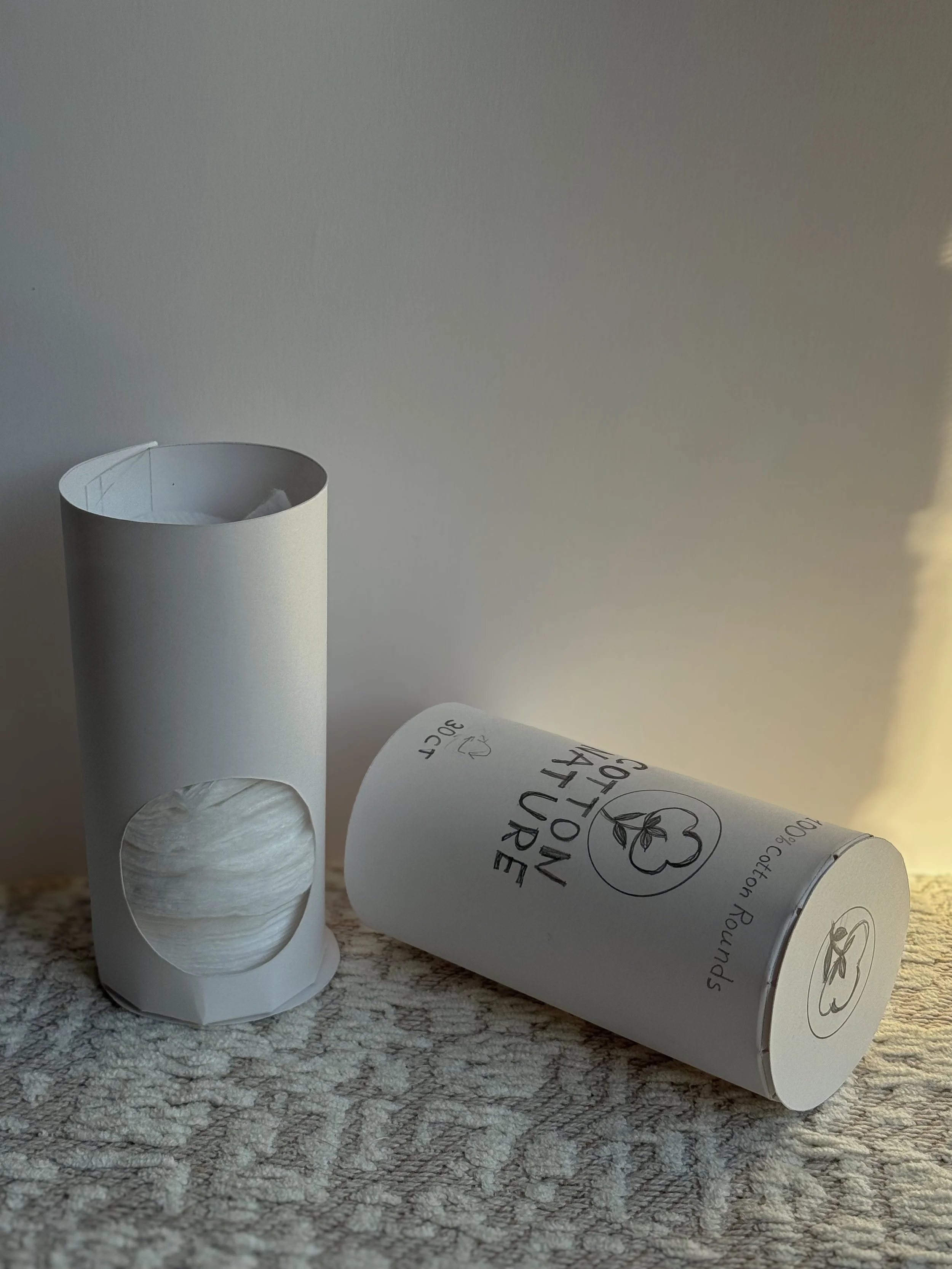 Cotton rounds were supposed to be clean and natural; the original packaging, however, was fully plastic and felt very wasteful and disposable. Replacing plastic for this redesign with a biodegradable paper structure and a functional cut-out opening for effortless use empowers the minimalist layout, together with a bold laser-cut style print, to have a countertop-worthy appearance, so the package feels like part of a daily routine.